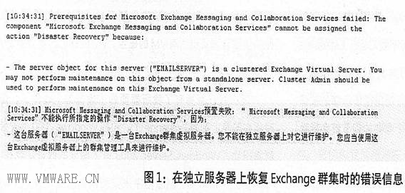 在真正开始测试前的几周,为了避免任何遗漏,我决定测试一下我的计划。我首先在测试环境中恢复了活动目录,然后准备使用带有/disasterrecovery参数的命令来安装Exchange。当安装仅仅进行了短短几秒钟后,我就看到了操作成功的提示,您可以想象我当时有多吃惊。很明显,一定有什么地方弄错了。我快速浏览了一下安装文件setup.log,发现如图1所示的报错。我立刻意识到我遇到麻烦了。我的计划有个大漏洞,简单来说,就是不能在独立服务器上恢复Exchange群集环境中的邮箱存储。