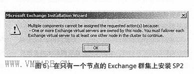 我下载了Exchange 2003 sP2,并尝试运行update.exe来安装它。但是却看见了如图6所示的报错。我的第一感觉是我需要搭建第二个群集节点。然后我想到了,“我是不是可以先停用群集,然后再安装servlce Dack?”于是我先停用了第一个节点,正如我预料的,我可以成功地运行uDaate.exe来安装SP2了。