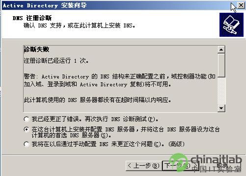 10.这里一般的话集成安装DNS比较好,如果是分离安装的话,对新手比较麻烦。因为AD会在DNS下创建许多SRV记录。