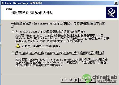 11.设置权限,其实就是为了与旧的系统AD迹象联系用的。一般来说默认就可以了!2000以前的已经没见过有人用了。