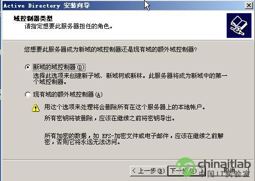4.创建域控制器的类型,我们这里因为是第一台域控制器,所以选第一项。第二项为创建备份域控制器做冗余的时候用的,这留到以后关于迁移域控制器的时候再跟大家说。