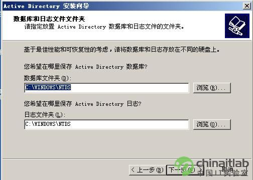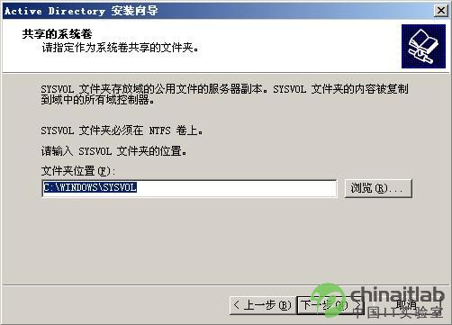 9.共享的系统卷,这里要注意了!此文件必须要放在NTFS卷上!而且sysvol文件是被用于以后的域信息同步的。所以在安装完后会自动的共享出来。