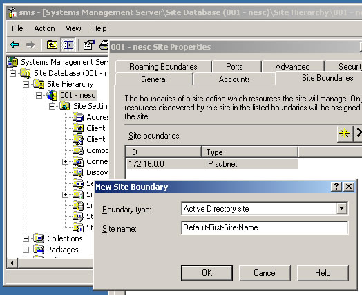 2)选择“Site Boundaries”,默认情况下SMS服务器已经自动把自己的子网地址加入到站点范围内。我们要添加额外的子网范围或者AD站点范围。建议增加AD站点范围。