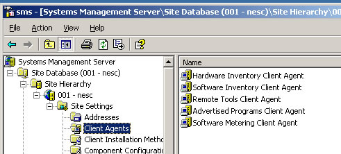 在SMS管理控制台中,选择 “Site Hierarchy >001>Site Settings>Client Agents”。可以在这里配置SMS客户端组件。