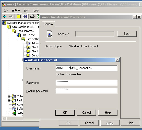 1)在SMS管理控制台中,选择 “Site Hierarchy >001>Site Settings>Connection Accounts>Client”,右击空白处,选择“new -> Windows User Account”