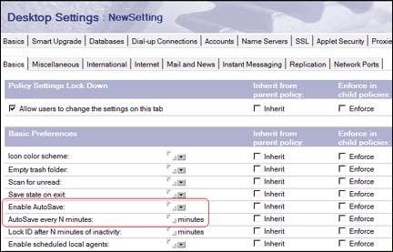 我们添加了一个复选框以启用 /禁用 AutoSave,以及一个用于设置时间间隔的字段。时间间隔可以是 1 分钟到999 分钟之间的任何值。这些 AutoSave 用户惯用选项与客户机的 Notes.ini 文件中的三个变量相对应。下表显示