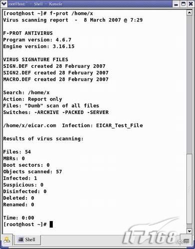 您可以从网址(http://www.eicar.org/anti_virus_test_file.htm )下载一个测试感染文件 http://www.eicar.org/download/eicar_com.zip 将其放在一个临时目录中。使用f-prot扫描该目录。然后查看结果,如果出现图2 界面表示安装fprot安装工作成功。