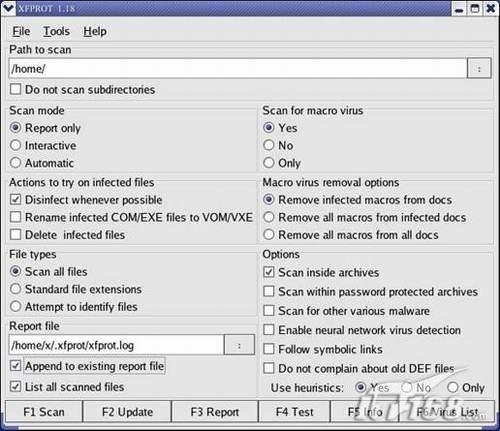 大家可能觉得命令行的方式不太友好,所以这里介始一个和f-prot相配的图形化界面xfprot(官方网址:http://web.tiscali.it/sharp/xfprot/ )。xfprot是用perl语言写的,可以运行在任何X-Windows环境下面,比如KDE或Gnome等。