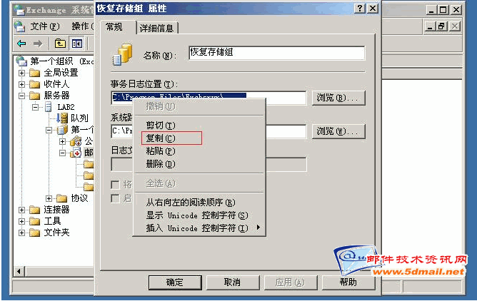 在建立的恢复存储组的下一步中,这一步非常重要,在这里要记住路径,因为这里是重播日志的路径,在进行还原的时候,把刚才backup文件里的日志放到这里来重新执行日志。从而生成没有备份以后的邮件。(这一步是重点)