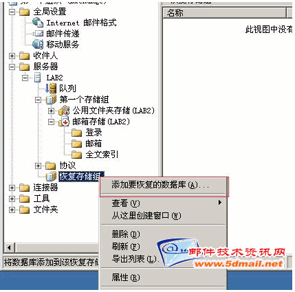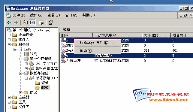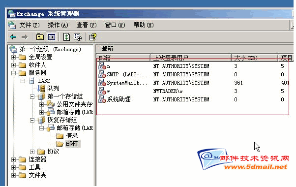 现在我们可以做还原的操作了,跟1楼所说的用恢复存储组还原exchange的邮箱数据一样啦。