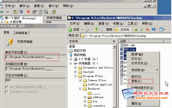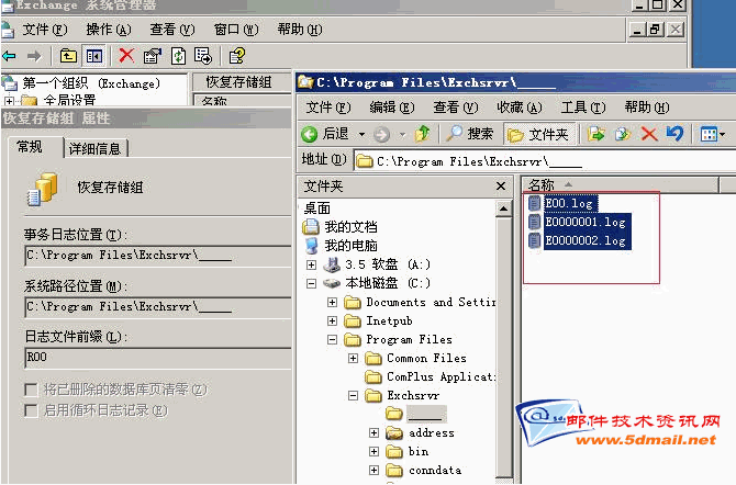 等一下就要做还原的操作,现在打日志文件放到恢复存储组的数据库文件里面,像7楼所说的,用于还原后重播日志文件,来达到恢复备份之后的邮件。