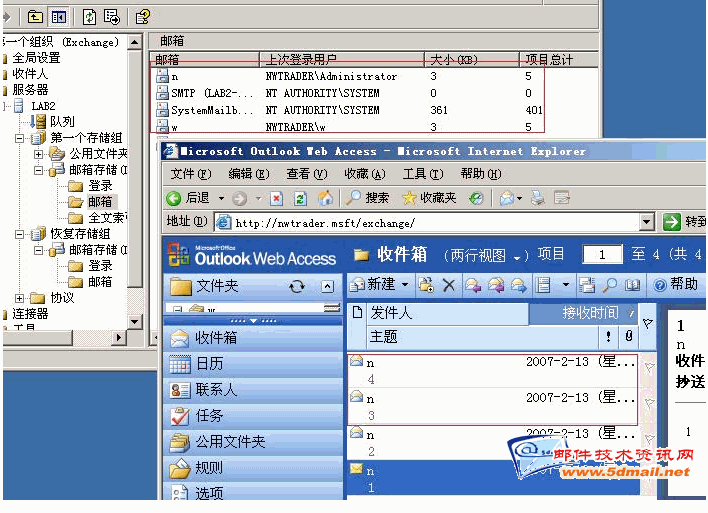 备份还原的操作到这里就剩下从恢复存储组还原到邮箱存储里面,从而看到结果了。