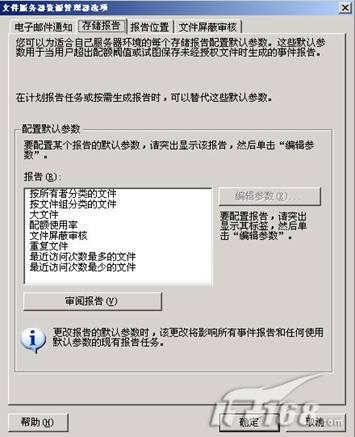 在“存储报告”选项卡上的“配置默认参数”下,选择要修改的报告类型。单击“编辑参数”。根据所选的报告类型,可以编辑的报告参数将有所不同。执行所有必要的修改,然后单击“确定”将其保存为该报告类型的默认参数。FSRM中提供了八种报告模板,在创建报告时,只能根据这八种报告模板来创建报告。如图6 。