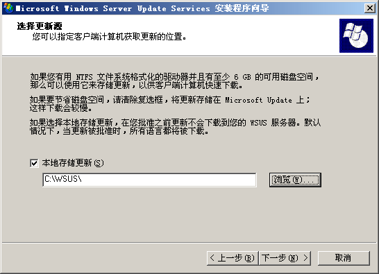 4. 在“选择更新源”页上,可以指定客户端获得更新的来源。如果选中“本地存储更新”复选框,更新便会存储在 WSUS 服务器上,您需要在文件系统中选择一个用于存储更新的位置。如果不在本地存储更新,客户端计算机将连接到 Microsoft Update 以获取已批准的更新。