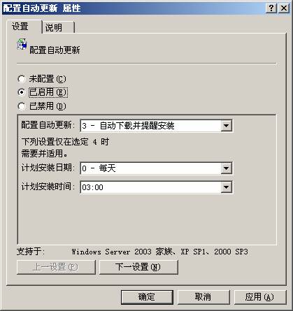 7、点击“配置自动更新“,在打开的”配置自动更新属性”选择“已启用“,并选择时间。