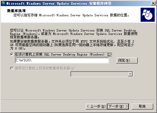 5. 在“数据库选项”页上,选择用于管理 WSUS 数据库的软件。默认情况下,如果要安装的计算机运行 Windows Server 2003,WSUS 安装程序将提出安装 WMSDE。如果无法使用 WMSDE,则必须为 WSUS 提供可以使用的 SQL Server 实例,具体操作方法是:单击“使用该计算机上现有的数据库服务器”,然后在“选择 SQL 实例名”框中键入实例名。然后 “下一步”。