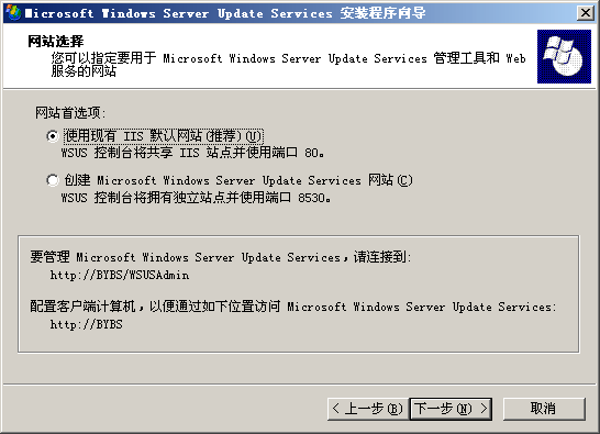 6. 在“网站选择”页上,指定 WSUS 将使用的网站。此页还列出了基于此选择的两个重要 URL:将 WSUS 客户端计算机指向其中以获取更新的 URL 以及用于配置 WSUS 的 WSUS 控制台的 URL。保留默认选项,然后单击“下一步”。