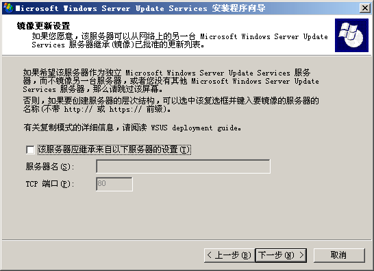 如果需要集中管理拓扑,而且这不是网络上的第一台 WSUS 服务器,请选中该复选框,然后在“服务器名”框中键入其他 WSUS 服务器的名称保留默认选项,然后单击“下一步”。