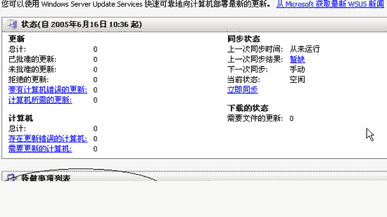 在上图所示界面的左侧点击“立即同步”将启动服务器的同步功能,服务器将连接微软官方Update服务器下载相应补丁。补丁类型已经在设定补丁操作中进行了选择,服务器将只下载满足设定条件的补丁,下载的补丁供客户端使用。在下载过程中我们不能进行任何操作,只能点击“停止同步”来结束更新操作。
