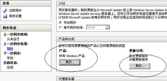 在 “计划”下的“手动同步”或“每天定时同步”,一般情况下设置为“每天定时同步”。另外还有“产品和分类”下方的设置,我们可以在产品处选择可供更新的产品种类,除了Windows外,还有Office、Exchange、SQL等产品的补丁和更新包都可以通过WS