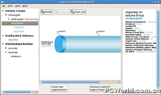 图3 在这次发布的RHEL5内核中,外观漂亮的LVM(逻辑卷管理)工具应该能与ext3文件系统恢复功能实现比较完美的结合。
