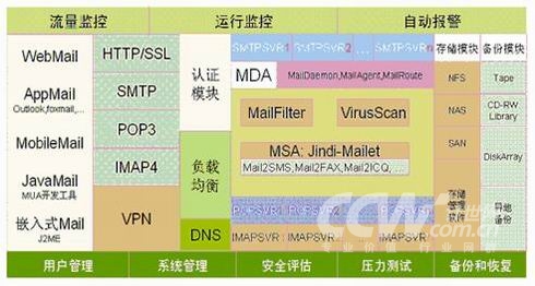 (2) SMTP、POP3、IMAP、用户认证、邮件存储等程序和数据固化,无法实现负荷分散和数据分布存储。 如Exchange, Lotus Mail, iMail等,这些邮件系统都无法经受病毒和垃圾邮件攻击,更无法经受大量用户并发投递的考验。