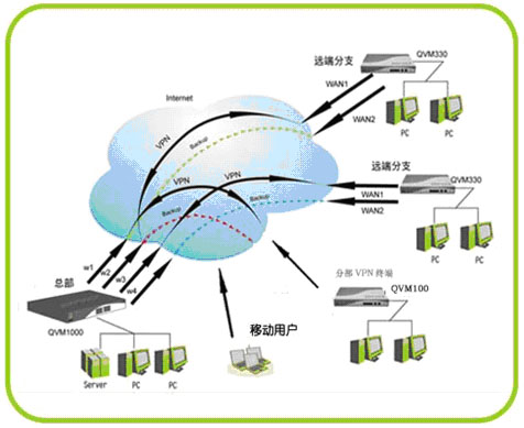对于以上总公司及分支机构的不同WAN口VPN联机均互相备援,以确保联机的稳定VPN联机采用IPSec协定,以保障联机的安全。总公司与各分公司的VPN设定,通过Qno侠诺专有的SmartLink功能进行。在外出差或想要连回总部或分公司的用户也可使用PPTP或IPSec方式连回企业网络,相对来说PPTP要比IPSec易配制,对移动办公用户比较适合。