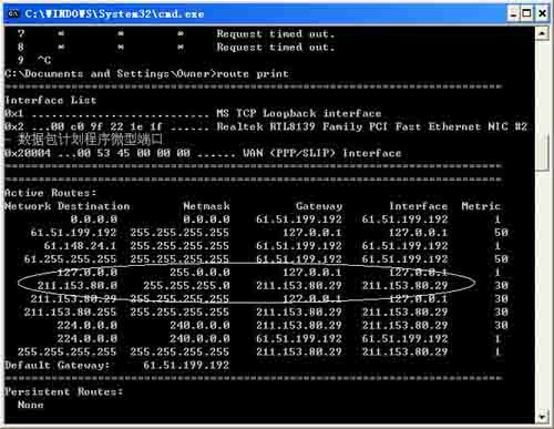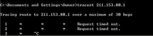 第一步:由于公司使用了防火墙所以用PING IP的方法是得不到反馈信息的,于是采取TRACERT命令。在命令行窗口中输入tracert 211.153.80.1。发现在第一跳就出现了 Request timed out。(如图1)这说明发向211.153.80.1的数据包没有到达第一个路由设备。在第一跳存在问题。