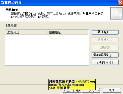 为此,我们打开ISA控制器,在左边Menu窗体下的“配置”-“网络”中新添加一个网络,这里为了便于记忆我命名为“CNC ADSL”,网络类型为外部网络,网络地址留空。