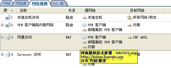 然后再新建一个网络规则,设置VPN客户端、被隔离的VPN客户端及内部网络与CNC ADSL网络之间为NAT关系。