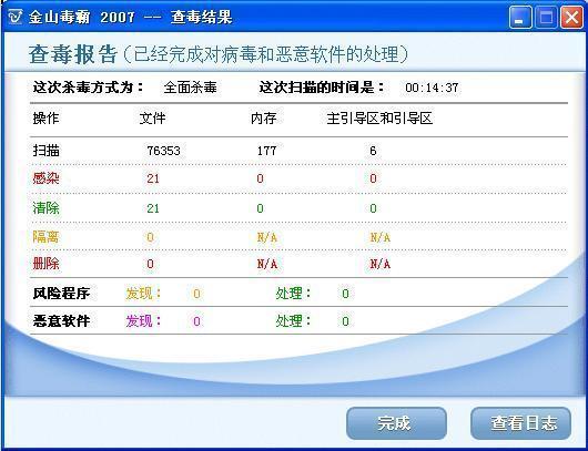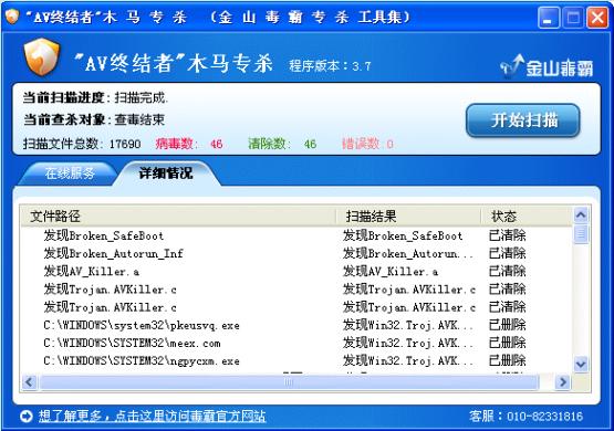 因为这个病毒同样会攻击金山毒霸,已经中毒的电脑会发同金山毒霸不能启动,双击没反应。利用手动解决相当困难,并且,AV终结者是一批病毒,不能简单的通过分析报告来人工删除。我们推荐的清除步骤如下: