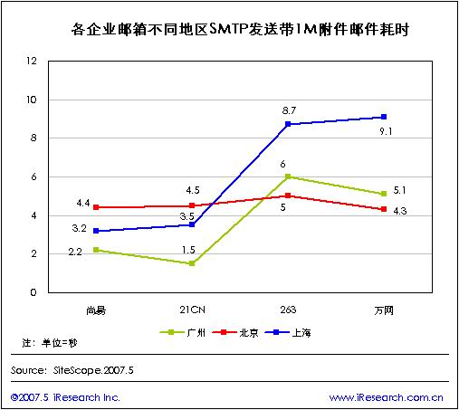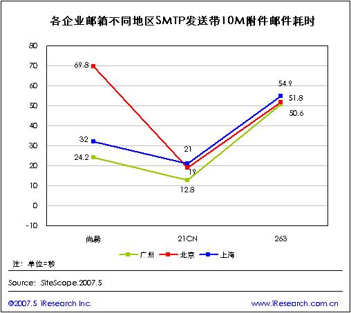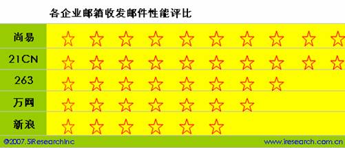 艾瑞调查报告显示:在五大企业邮箱中,尚易和21CN均表现出卓越的收发邮件性能。此次收发邮件性能的评测项目包括:广州、上海、北京三地普通邮件及带附件(1M和10M)邮件的收发速度。五大企业邮箱不带附件的普通邮件稳定性都比较均衡,其中发送速度最快的是21CN广州地区,接收速度最快的是万网北京地区。在带1M附件邮件的收发速度上,尚易表现最佳,21CN居第二。在10M大附件的发送速度上,21CN整体优于其他邮箱,且其广州地区的发送速度最快;同时,21CN在北京的邮件发送速度也是同类产品中最优的,据悉,21CN通过在电信、网通部署邮件服务器解决了南北互联互通问题,另外通过在香港部署邮件服务器也解决了邮件的海外发送速度问题。而在10M大附件接收速度上,263的优势比较明显,尚易的表现也不错。