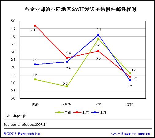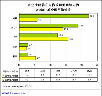 在本次测试中,艾瑞使用iwebspeed全国样本测速系统,在一周时间内,通过国内32省6000多用户,进行了1.2万余次的测试,访问各邮箱服务商web内http服务器的响应速度。测试结果显示:在电信网络内,尚易的全国平均速度达22.2 byte/ms, 21CN的全国平均速度达18.9 byte/ms,两者都以显著优势快于其他企业邮箱在web中显示出的速度;在网通网络内,263.net企业邮箱的全国平均速度达15.6 byte/ms。21CN的全国平均速度达13.9 byte/ms,两者也都以显著优势快于其他企业邮箱在web中显示的速度。