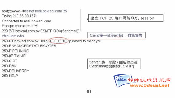 邮件在通过smtp发信时是如何发送的,在整个会话中是如何建立连接的,大家通过下面的图示可以了解,在smtp建立连接时主要通过25port,要自我宣告信息(来源域名和ip),对方的服务器如果存在会回应信息,然后检查收件人回应信息,所有的信息都会记录在head中,最后传输信件的内容和附件,最总整个传输过程结束。