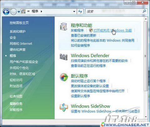 Vista系统默认情况下并不会安装“Internet 信息服务”,这还得你手工添加。点击“开始菜单”→“所有程序”→“控制面板”,进入控制面板主页。点击“程序”选项,进入后点击链接“打开或关闭Windows功能”,如图1。