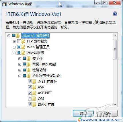 Vista会自动弹出“用户帐户控制(UAC)”对话框,用户需要“确认”后才能继续下一步操作。接下来进入“打开或关闭Windows功能”对话框,在程序列表中勾选“Internet信息服务”,如图2。