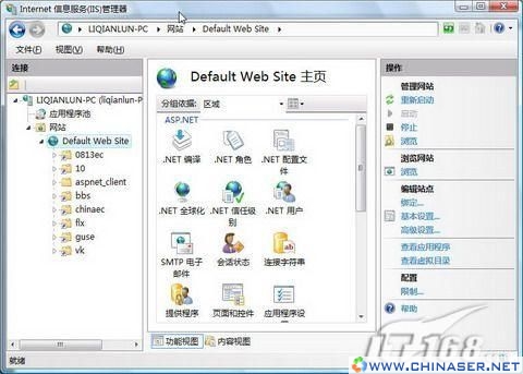 IIS安装完成后,就可以在“管理工具”中找到“Internet 信息服务(IIS)管理器”了,点击,即可进入全新的IIS 7,如图3。