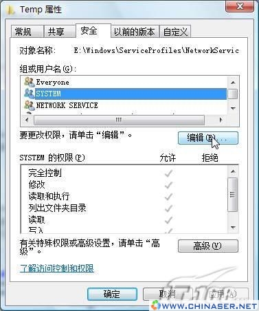 我们需要对一个系统文件夹做权限设置来解决问题,具体文件夹为:系统安装盘:\Windows\ServiceProfiles\NetworkService\AppData\Local\,选择其中的Temp文件夹,调用右键菜单,点击“属性”进入。进入对话框后,选择“安全”选项卡,单击“编辑”按钮,如图5。