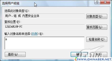接下来在“组和用户名”列表中,点击“添加”按钮。进入对话框后,在“输入对象名称来选择”中建入“a”(后面Vista会自动提示所有名字带有a的用户),点击“确定”按钮,如图6。