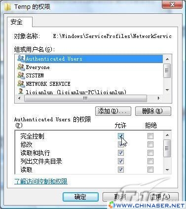 进入新对话框,在“匹配名称”中选择“Autheticated Users”,用户添加完成。接下来你要做的就是提升“Autheticated Users”用户的权限为“完全控制”,如图7。