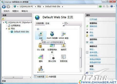 进入“Internet 信息服务管理器”,在左侧列表选择默认网站“Default Web Site”(当然也可以是任何虚拟目录),在窗口中间的“功能视图”中找到IIS项目下的“ASP”,鼠标双击进入,如图8。