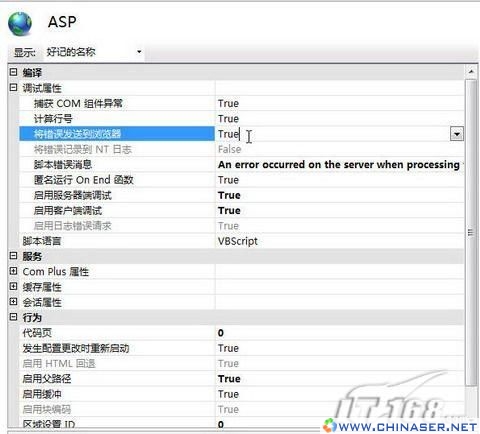 进入后可供修改的参数很多,我们着重修改两处值即可:“调试属性”→“将错误发送到浏览器”以及“行为”→“启用父路径”,它们的默认值均为False,修改值为True即可,如图9。