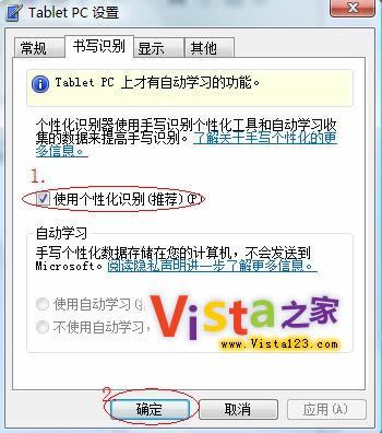 2.在“手写识别”选项卡上,清除“使用个性化的识别器 (推荐)”复选框。