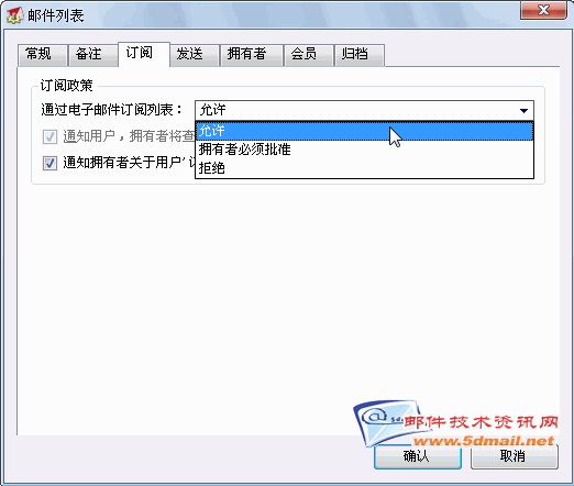 2.将邮件列表的“订阅政策”确定为“允许”通过电子邮件订阅列表。如下图: