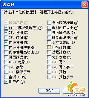 有时候,我们虽然挖空心思找到了占用“流氓”文件的具体工作进程,可是当我们尝试在系统的进程标签页面中结束该目标进程时,该顽固系统进程怎么也无法被顺利结束掉。碰到这种特殊情形时,我们可以先进入到系统的任务管理器窗口,单击该窗口中的“进程”标签,检查对应标签页面中是否已经显示出了对应某个进程的标识符,如果没有看到进程标识符时,我们可以依次单击任务管理器窗口中的“查看”/“选择列”菜单命令,打开如图3所示的设置窗口,选中该窗口中的“PID(进程标识符)”项目,再单击“确定”按钮,返回到系统的“进程”标签页面中;