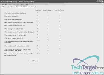 每一个可能进行的操作(使用CDO发送项目,使用简单MAPI查询地址簿项目,等等操作)是被独立控制的。当安装在客户端的第三方软件想要进行一些操作,你的指定操作是很有效率的:客户端不但自动相应请求(这应用于没有安全更新的Outlook 2000),进行请求拒绝,同时还提醒用户(已经进行了安全更新的Outlook的默认操作)。