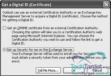 如果你不使用Windows Server 2003 CA来手动或自动地登记一个证书,你要通过启动Outlook,去让Outlook去请求你的新证书,做法为:选择工具|选项命令,点击安全标签,并点击获取一个数字ID。当下一步既不依赖于你通过Exchange KMS申请一个证书,也不依赖于从一个外部CA。要想获得更多的有关Windows Server 2003安装和使用证书自动登记的知识,请参考技术百皮书。