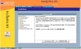 在SmartDefense服务优化配置界面,我们可以看到,Safe@Office为我们提供了大量主流的应用优化控制能力,包括防止网络攻击(LAND、DDOS……);TCP、FTP、HTTP、IGMP等协议控制的高级设置;P2P应用控制;IM即时通信应用控制等多种深入控制功能。为现今网络安全管理员最棘手的多种安全问题提供了强大的解决方案。实现了入侵防御、P2P控制等多种安全功能。