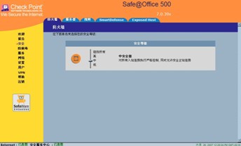 Safe@Office设备在防火墙功能设置上采取了与国内外著名厂商在个人防火墙上采用的简单设置方式,提供了四种不同的安全级别,结合CheckPoint公司在网络安全方面的成功经验,为普通网络系统管理员提供了更简单更安全的设置方式,分别为高中低三个层次的设置区域,用户可根据自己的网络需要进行相应规划和调整。