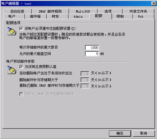 “帐户”-“帐户管理器”-打开某帐户“帐户编辑器”-“配额”,可以设定用户的邮箱存储邮件数量以及存储空间。